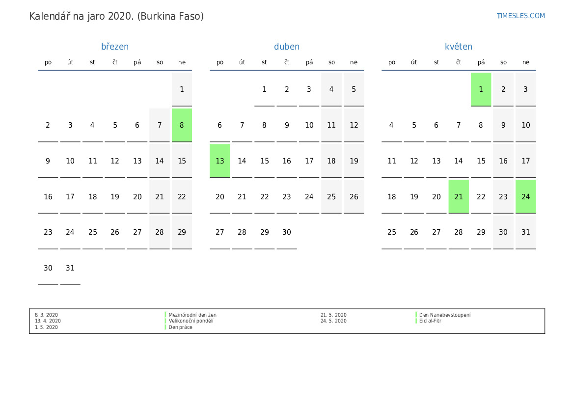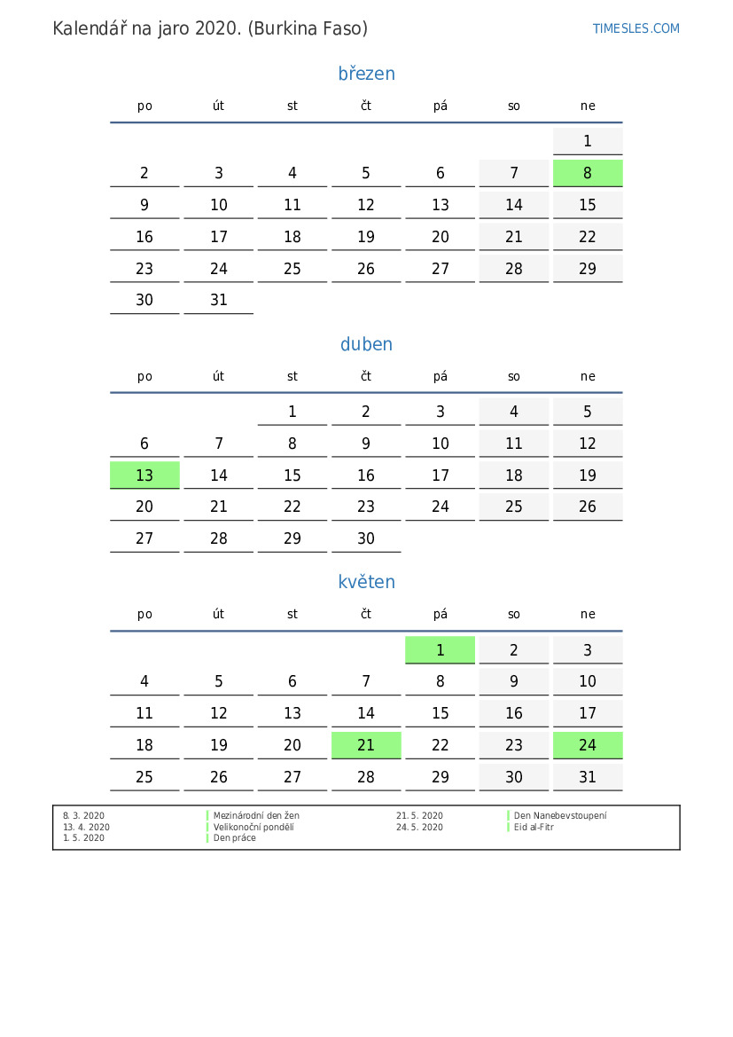 Stáhněte si a vytiskněte si kalendář PDF se svátky a víkendy na jaro 2020 pro Burkinu Faso