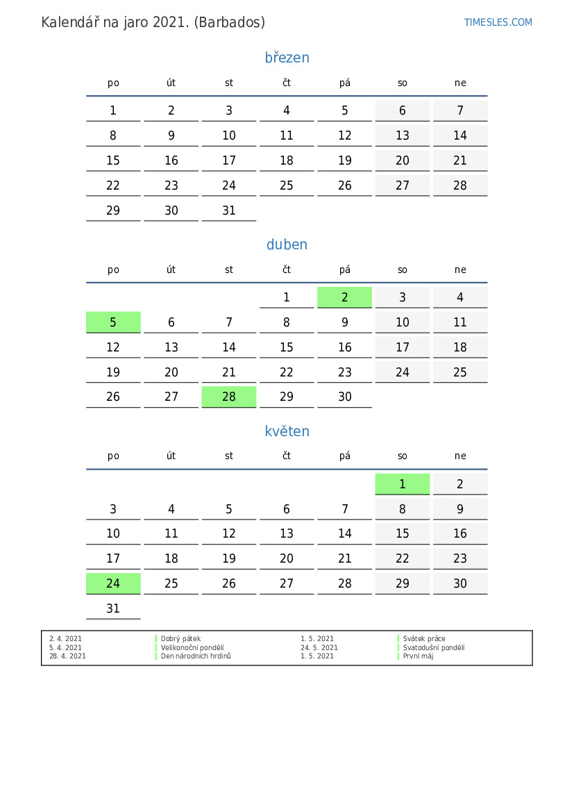 Stáhněte si a vytiskněte si kalendář PDF se svátky a víkendy na jaro 2021 pro Barbados