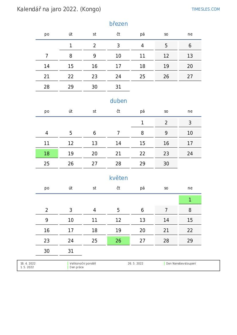 Stáhněte si a vytiskněte si kalendář PDF se svátky a víkendy na jaro 2022 pro Kongo