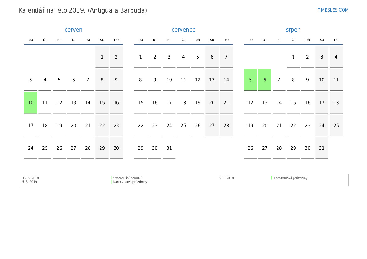 Stáhněte si a vytiskněte si kalendář PDF se svátky a víkendy na léto 2019 pro Antiguu a Barbudu