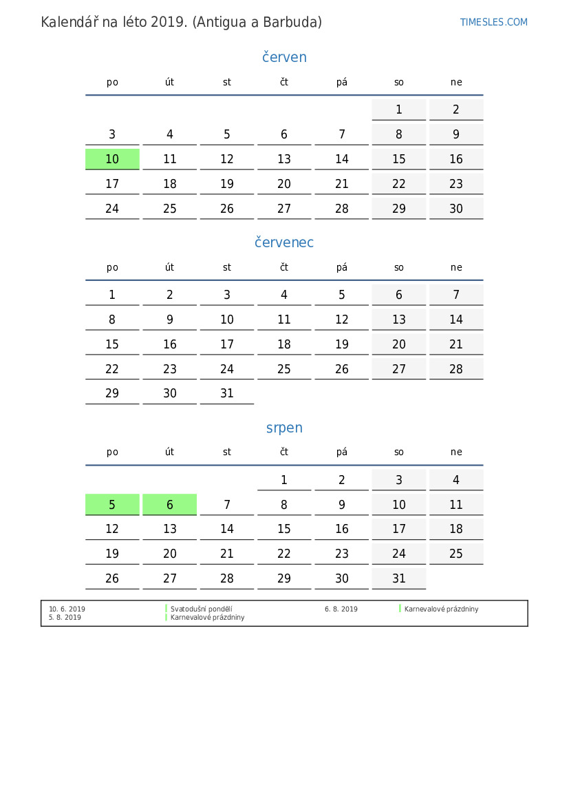 Kalendář na léto 2019 pro Antiguu a Barbudu