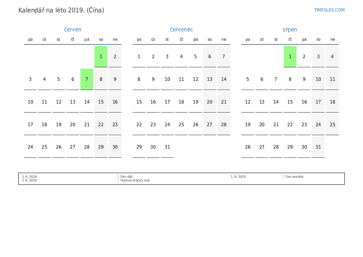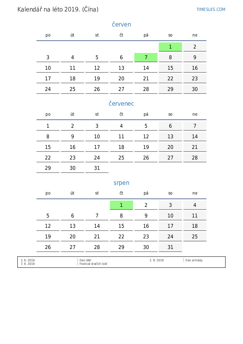 Stáhněte si a vytiskněte si kalendář PDF se svátky a víkendy na léto 2019 pro Čínu
