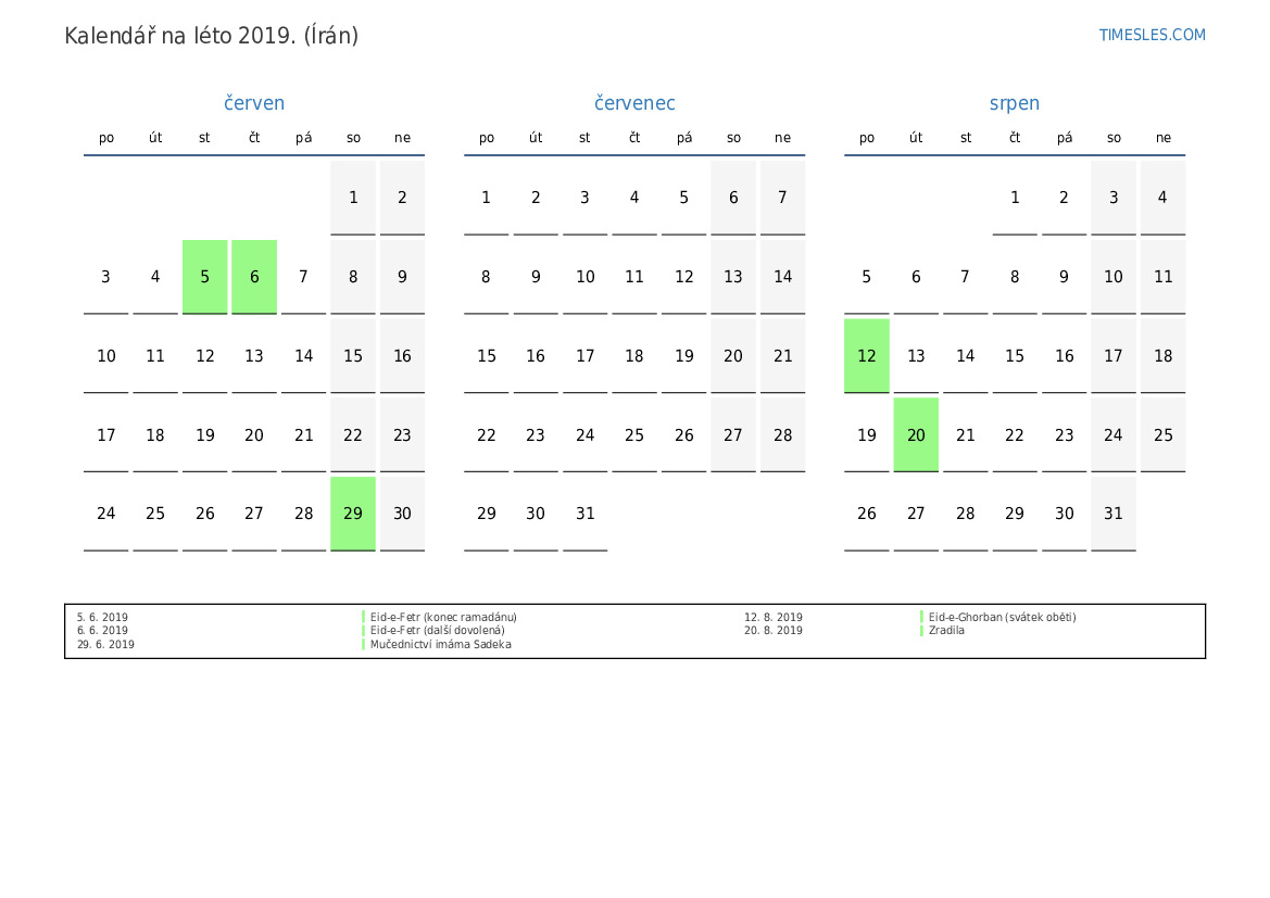 Stáhněte si a vytiskněte si kalendář PDF se svátky a víkendy na léto 2019 pro Írán