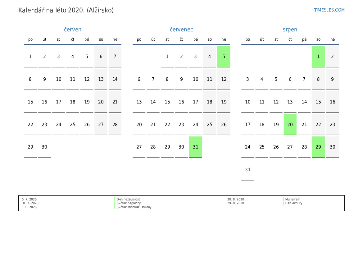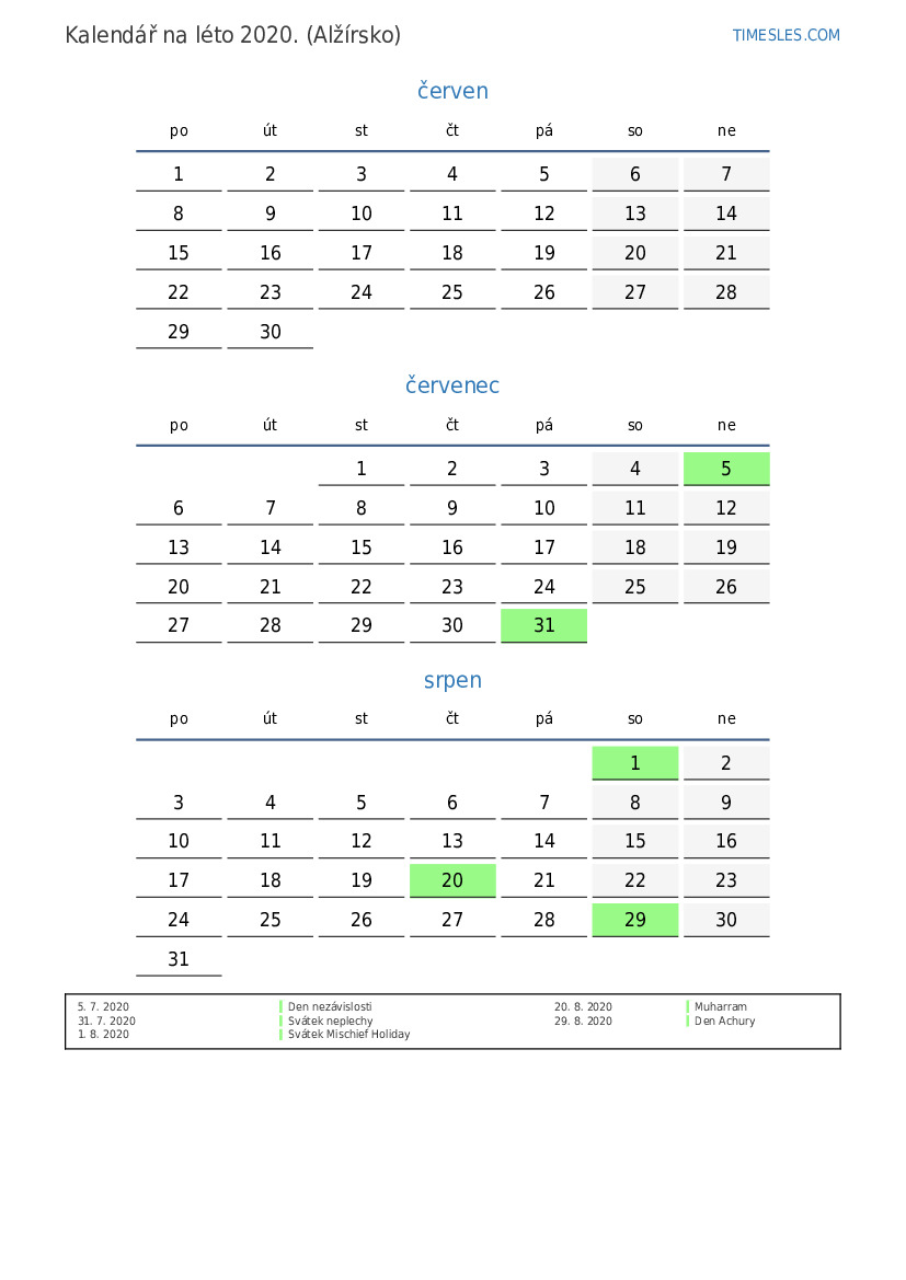 Stáhněte si a vytiskněte si kalendář PDF se svátky a víkendy na léto 2020 pro Alžírsko