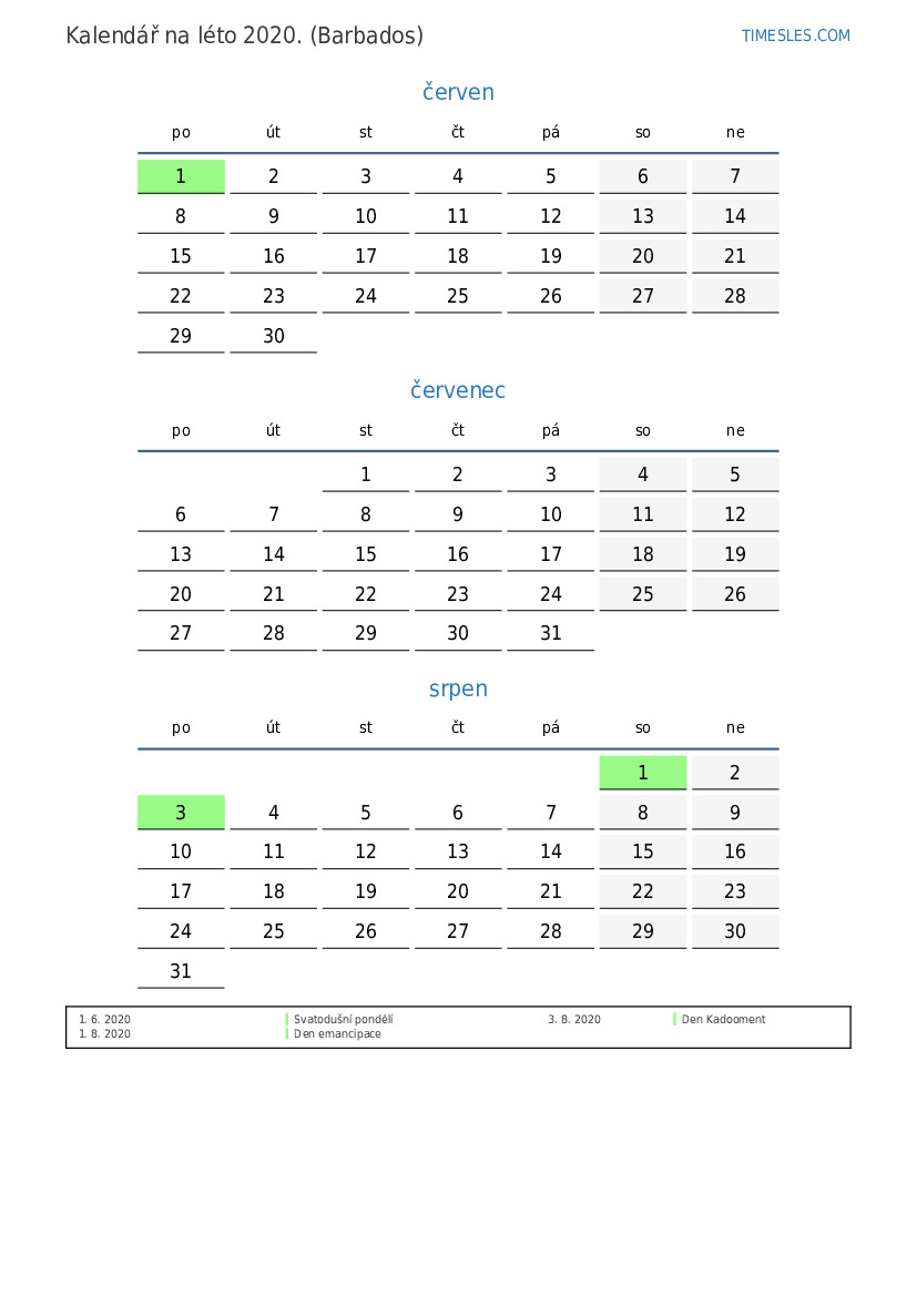 Kalendář na léto 2020 pro Barbados
