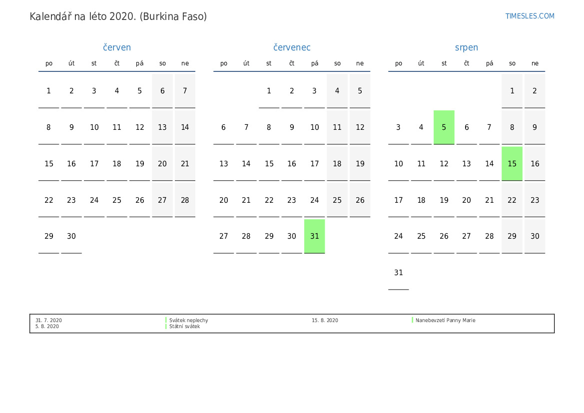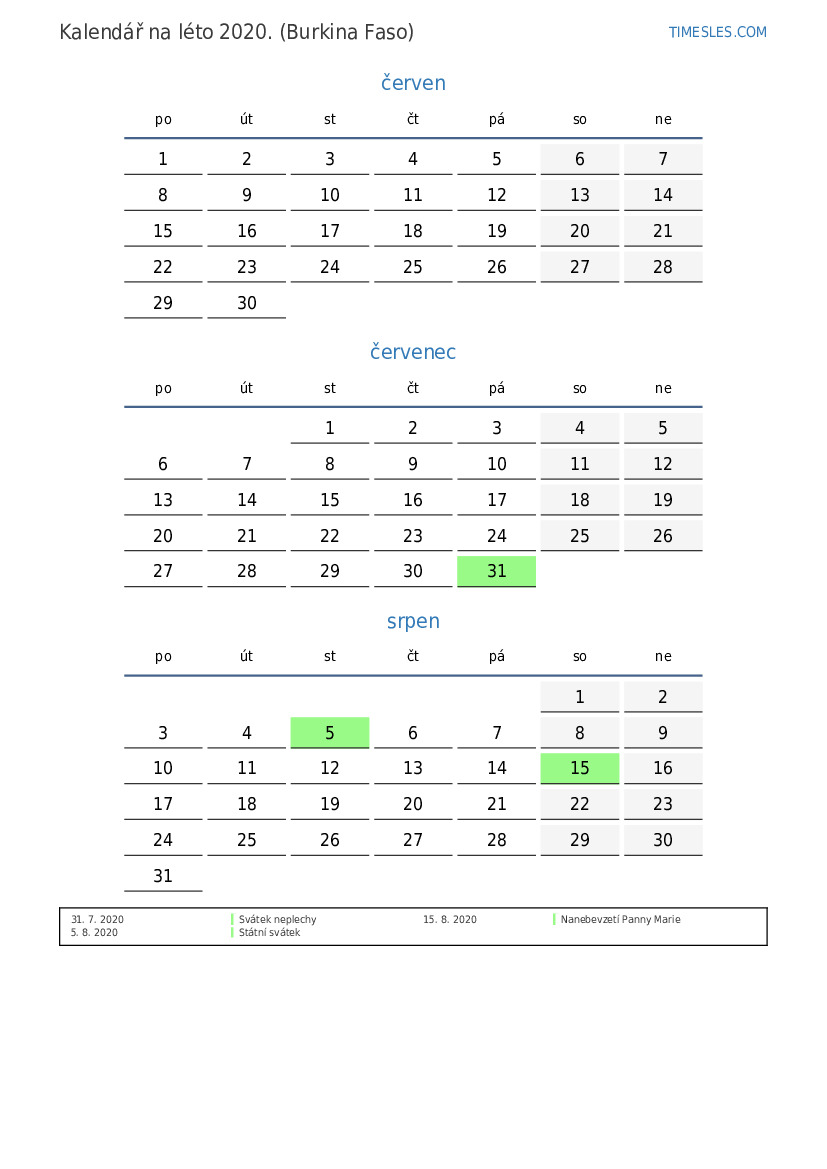 Stáhněte si a vytiskněte si kalendář PDF se svátky a víkendy na léto 2020 pro Burkinu Faso