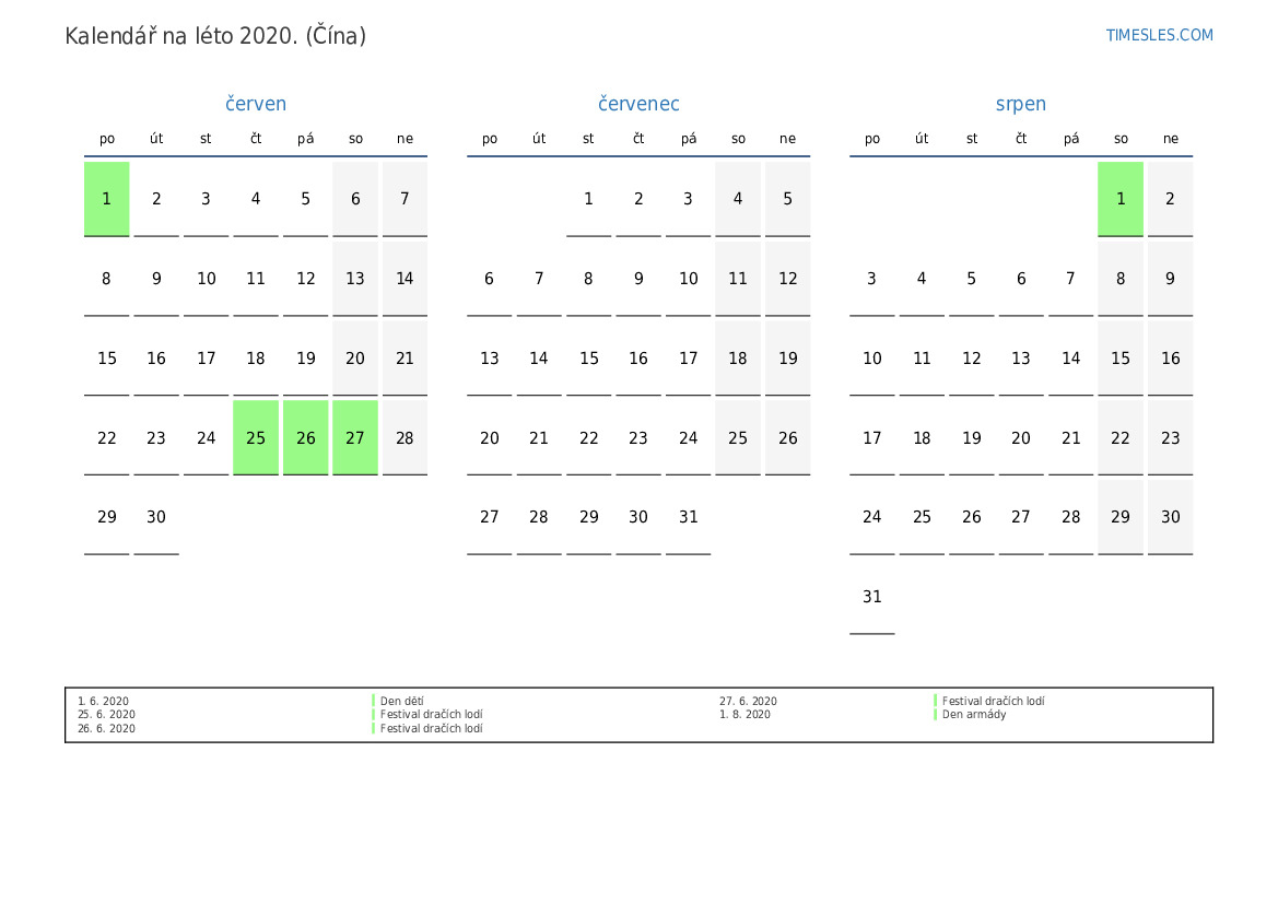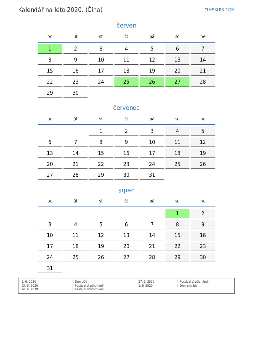 Stáhněte si a vytiskněte si kalendář PDF se svátky a víkendy na léto 2020 pro Čínu