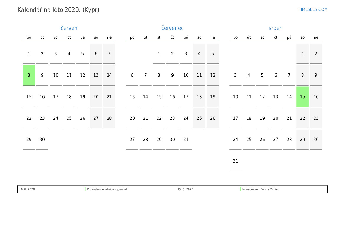Stáhněte si a vytiskněte si kalendář PDF se svátky a víkendy na léto 2020 pro Kypr