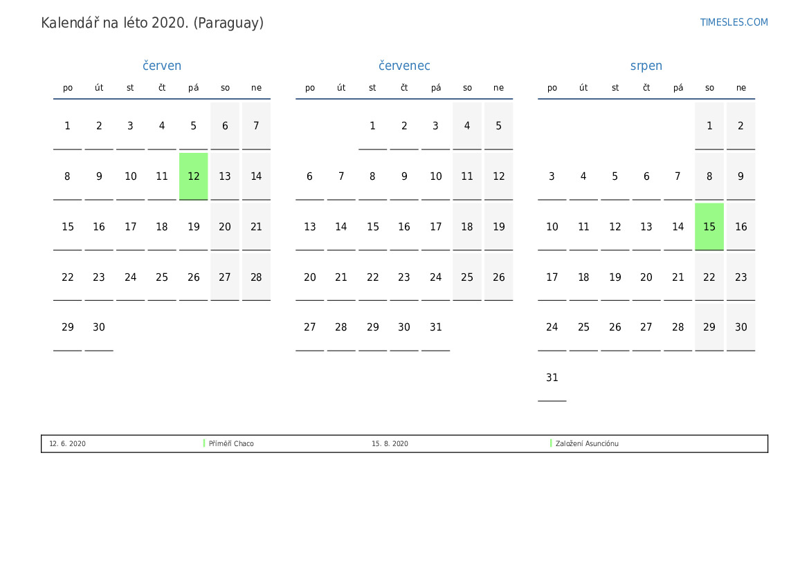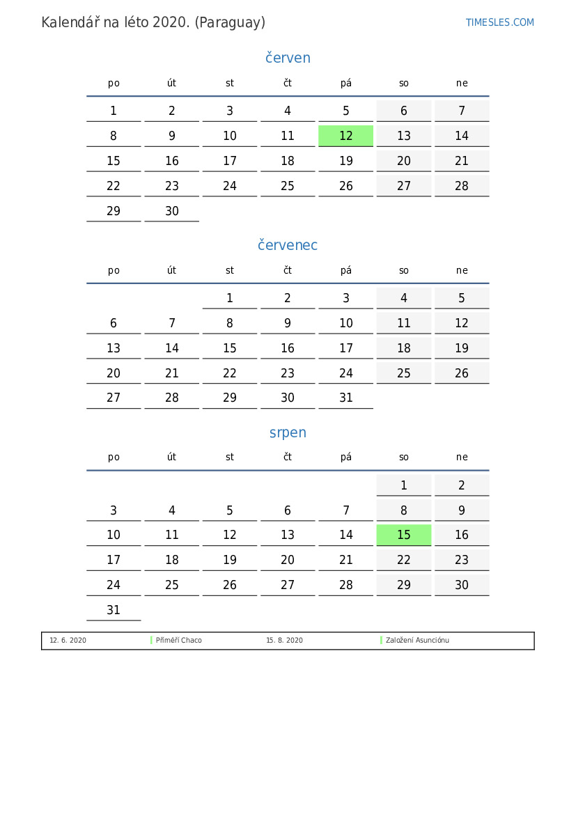 Stáhněte si a vytiskněte si kalendář PDF se svátky a víkendy na léto 2020 pro Paraguay