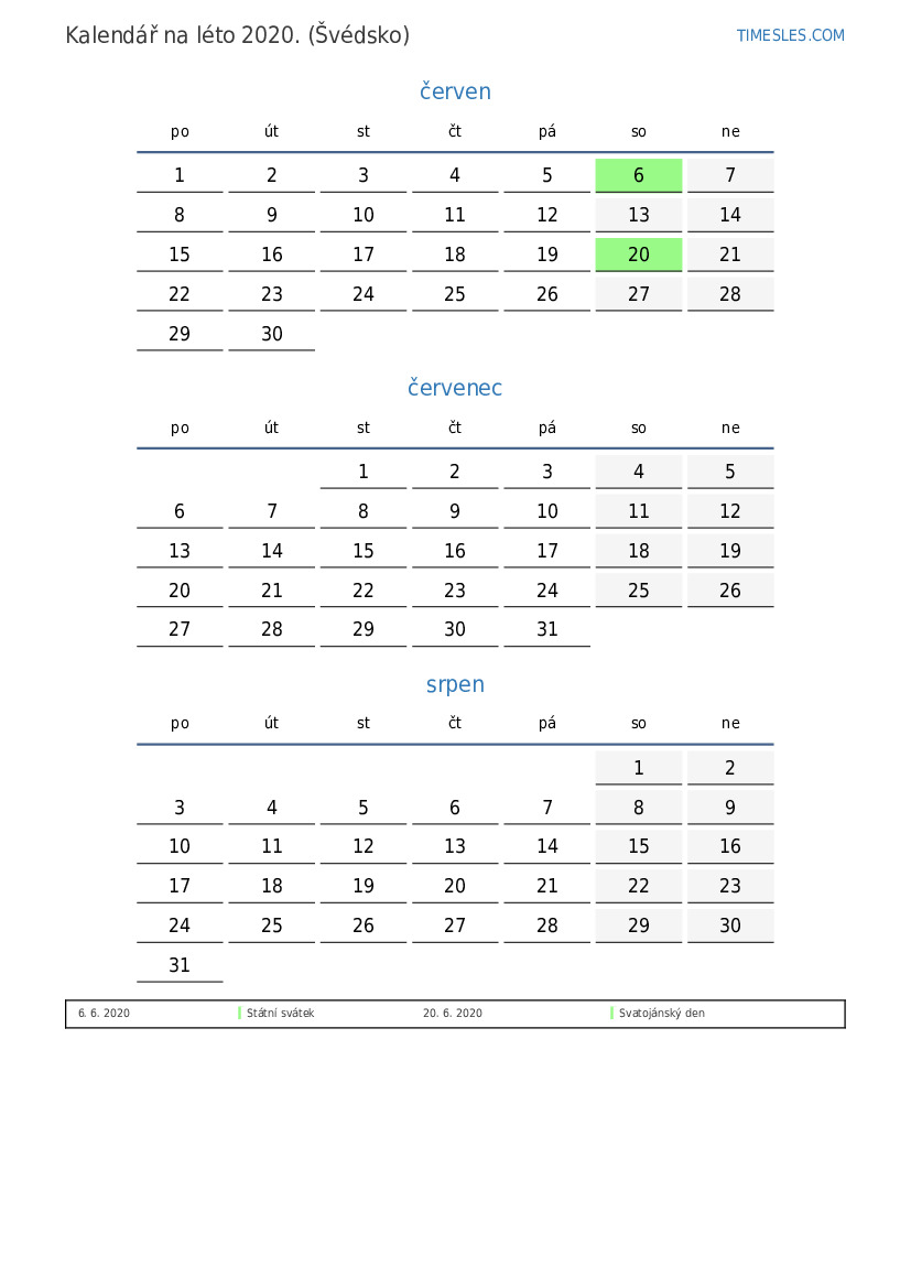 Stáhněte si a vytiskněte si kalendář PDF se svátky a víkendy na léto 2020 pro Švédsko