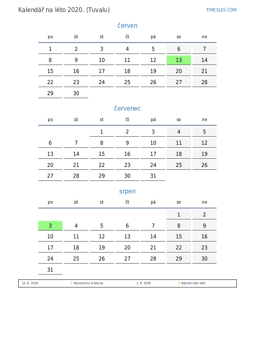 Stáhněte si a vytiskněte si kalendář PDF se svátky a víkendy na léto 2020 pro Tuvalu