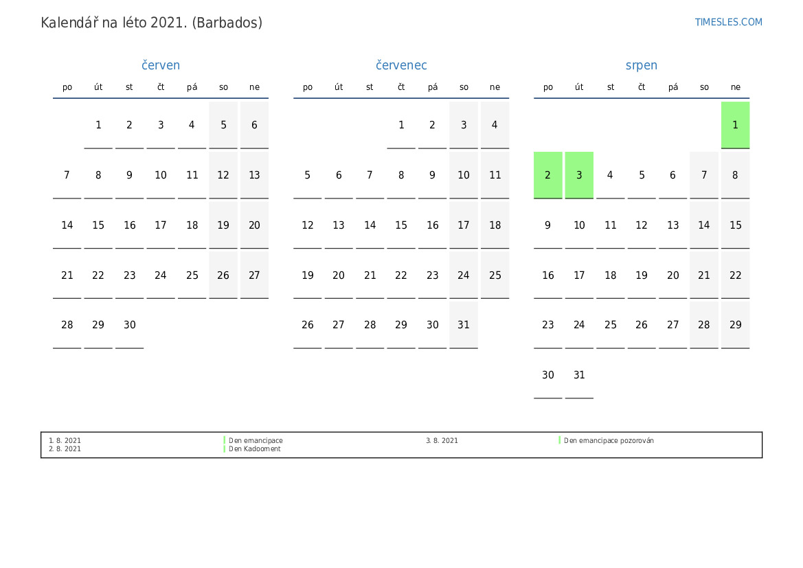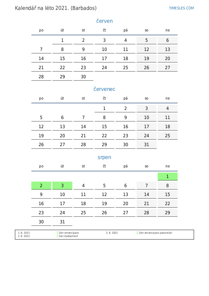 Stáhněte si a vytiskněte si kalendář PDF se svátky a víkendy na léto 2021 pro Barbados