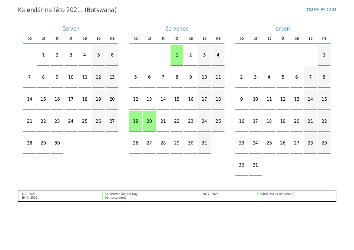 Stáhněte si a vytiskněte si kalendář PDF se svátky a víkendy na léto 2021 pro Botswanu