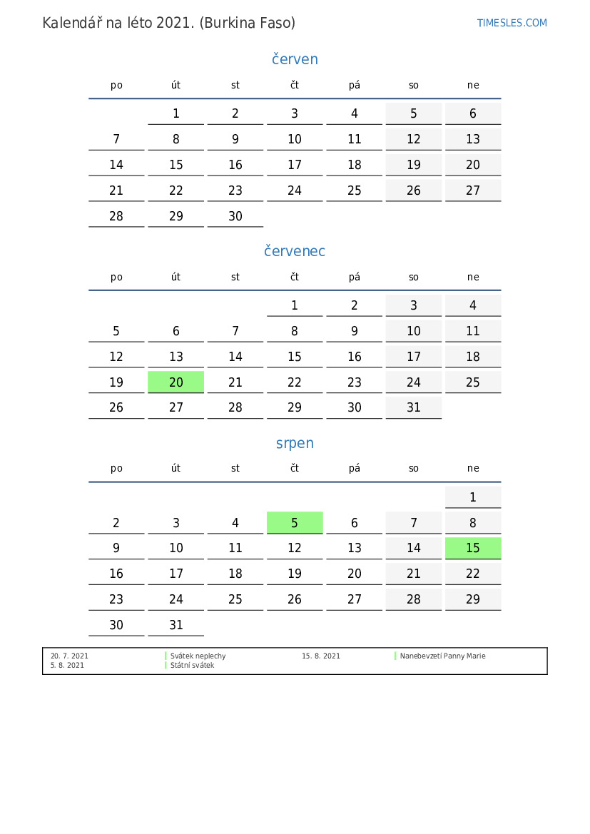 Kalendář na léto 2021 pro Burkinu Faso