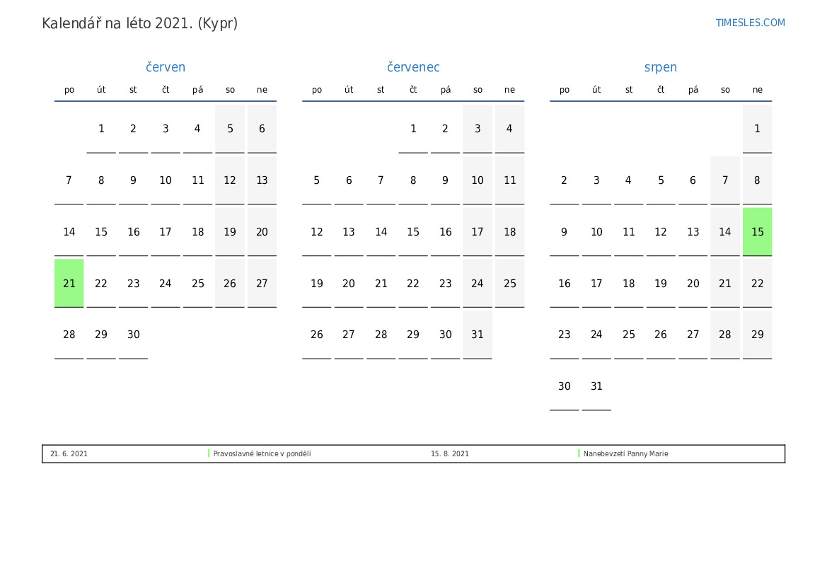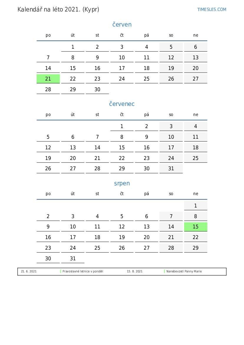 Stáhněte si a vytiskněte si kalendář PDF se svátky a víkendy na léto 2021 pro Kypr