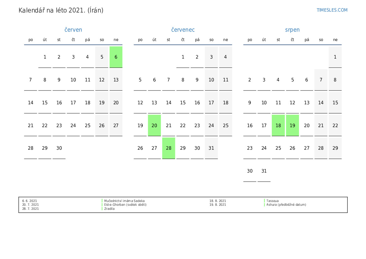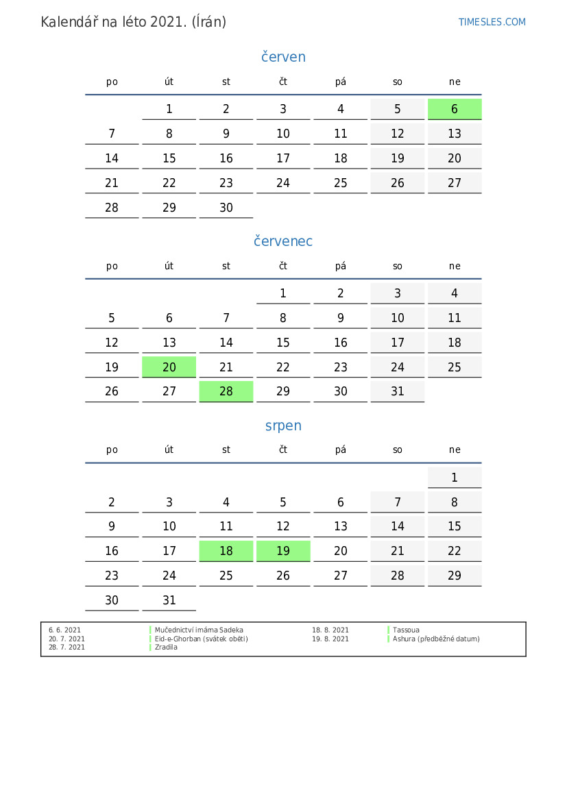 Stáhněte si a vytiskněte si kalendář PDF se svátky a víkendy na léto 2021 pro Írán