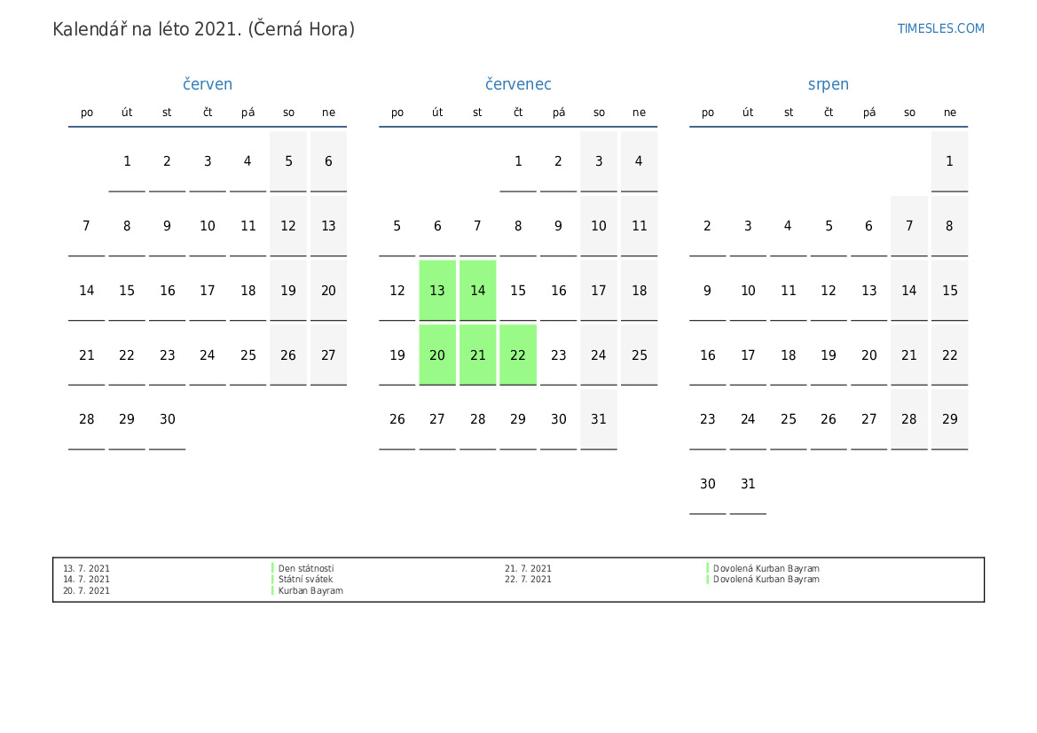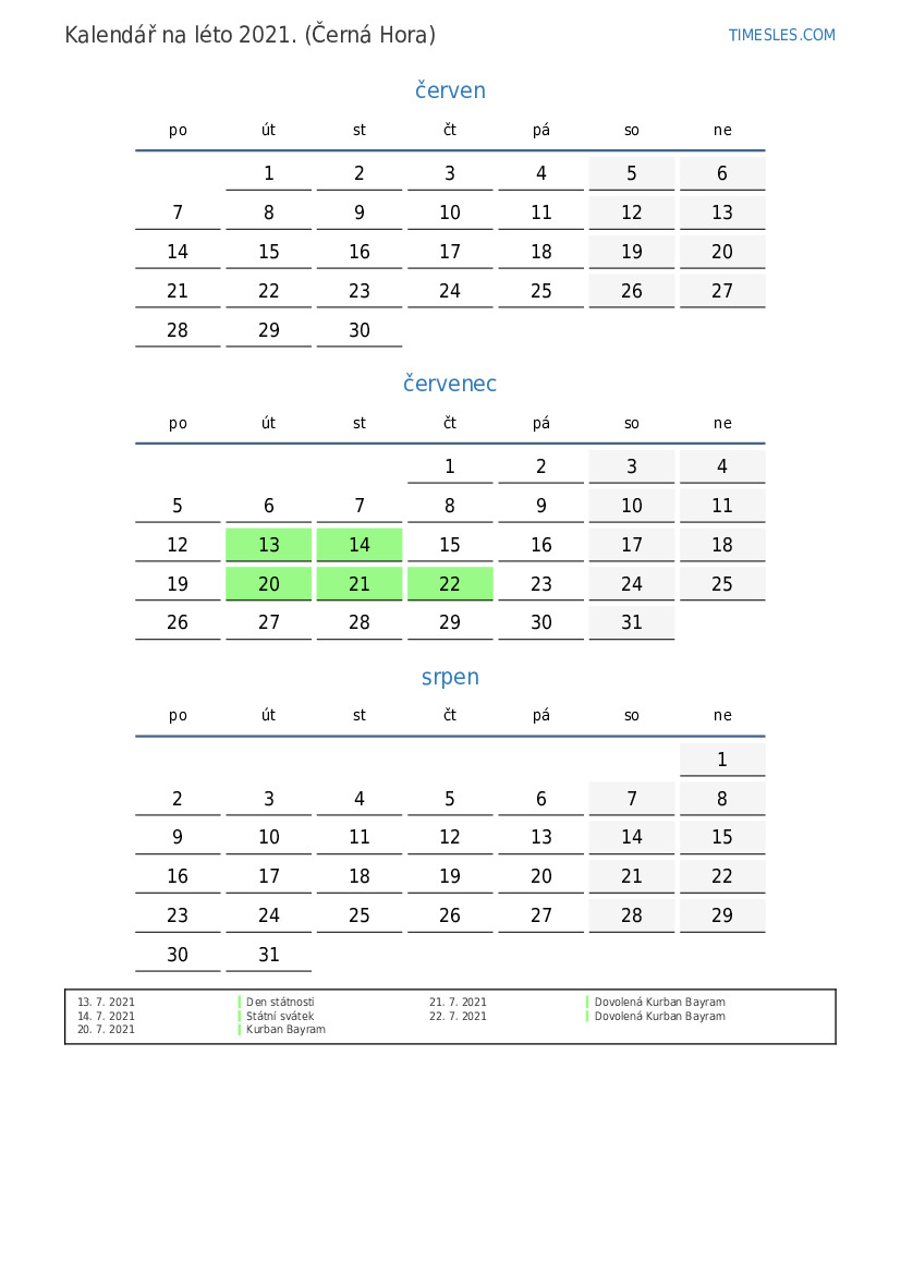 Stáhněte si a vytiskněte si kalendář PDF se svátky a víkendy na léto 2021 pro Černou Horu