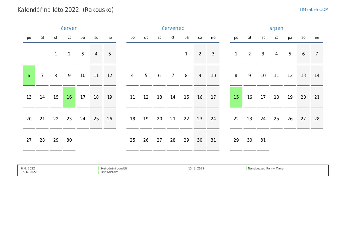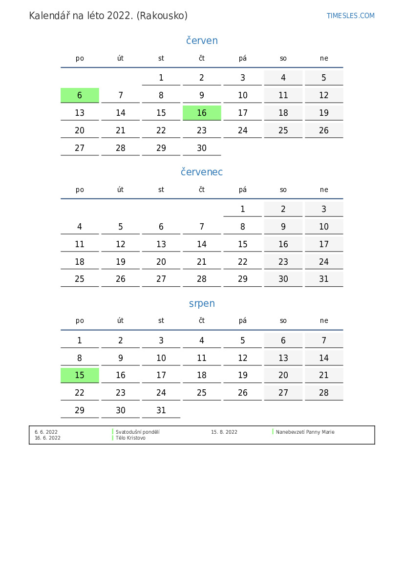 Stáhněte si a vytiskněte si kalendář PDF se svátky a víkendy na léto 2022 pro Rakousko
