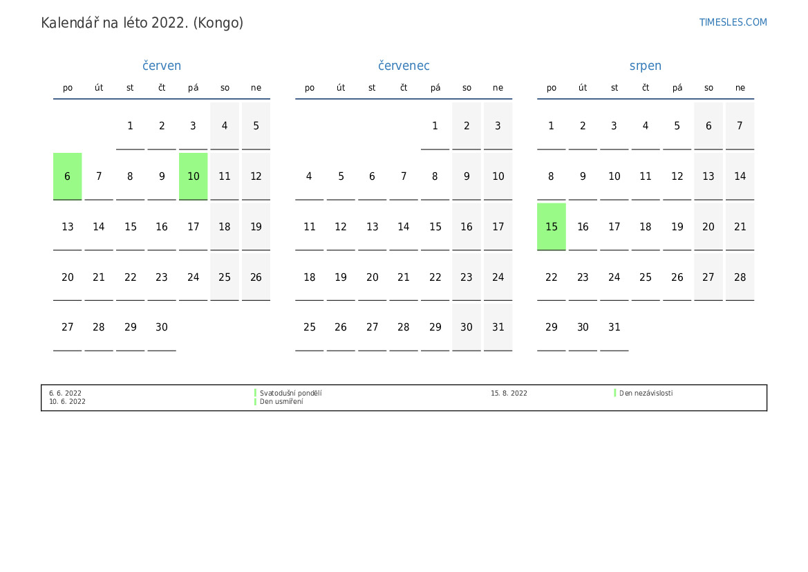 Stáhněte si a vytiskněte si kalendář PDF se svátky a víkendy na léto 2022 pro Kongo