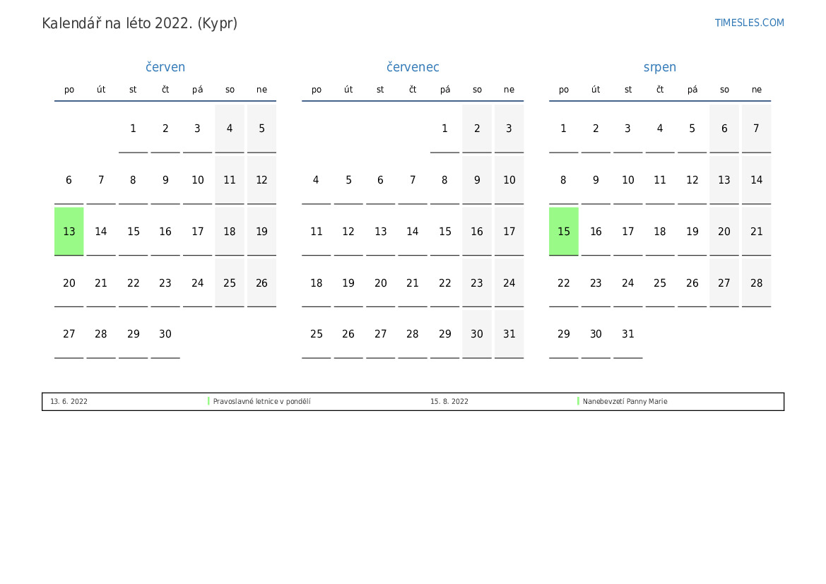 Stáhněte si a vytiskněte si kalendář PDF se svátky a víkendy na léto 2022 pro Kypr