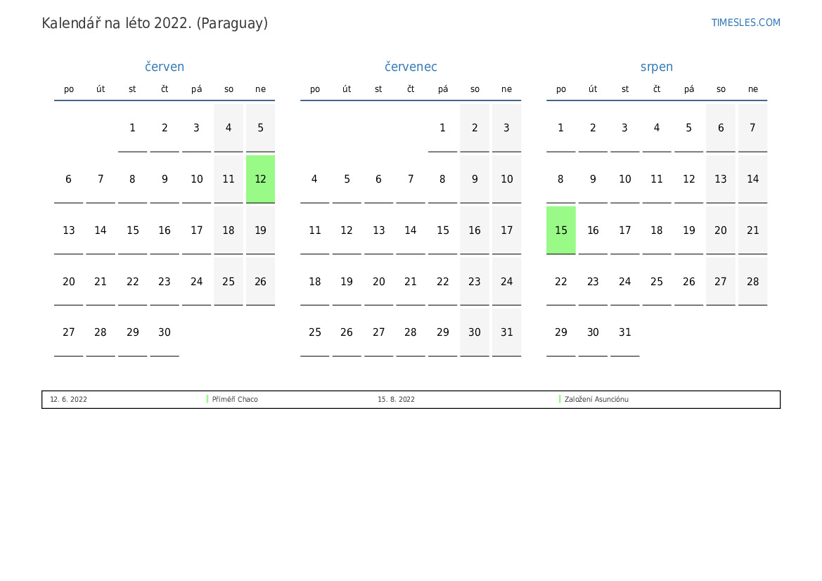 Stáhněte si a vytiskněte si kalendář PDF se svátky a víkendy na léto 2022 pro Paraguay