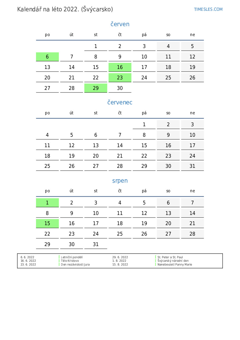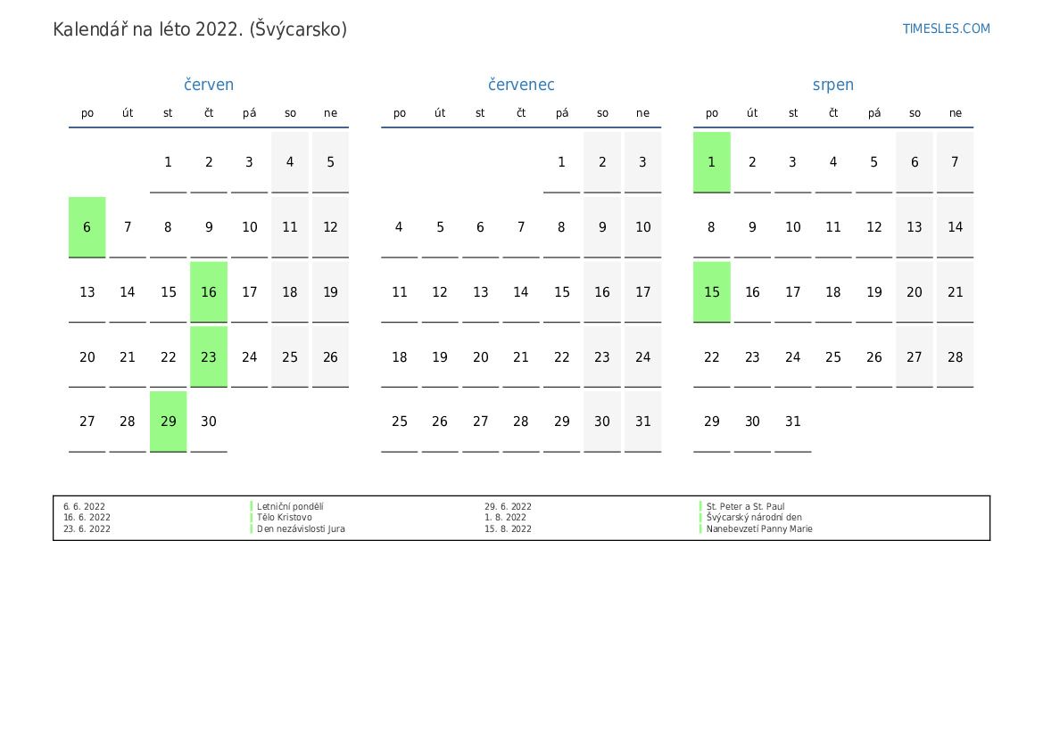 Kalendář na léto 2022 pro Švýcarsko