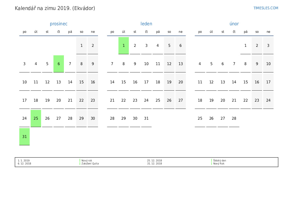 Stáhněte si a vytiskněte si kalendář PDF se svátky a víkendy na zimu 2019 pro Ekvádor