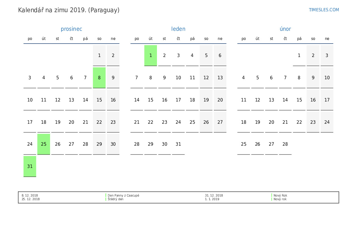 Stáhněte si a vytiskněte si kalendář PDF se svátky a víkendy na zimu 2019 pro Paraguay