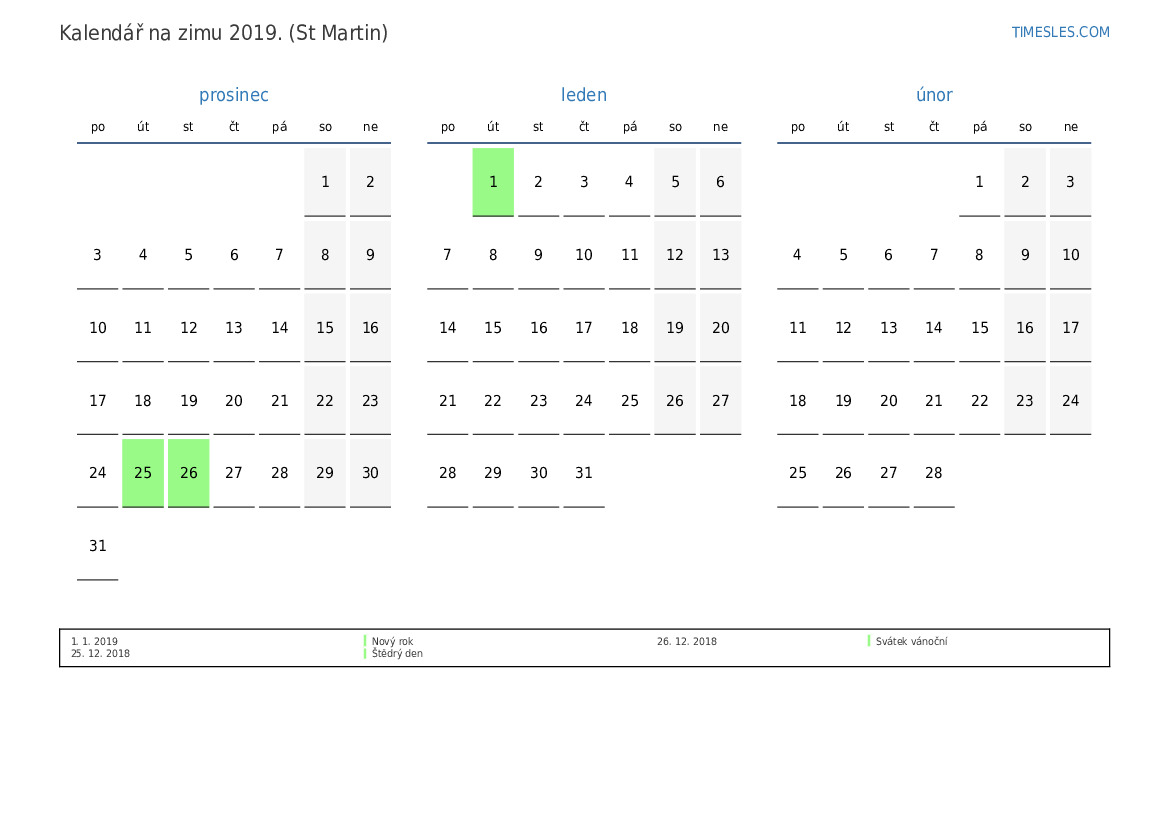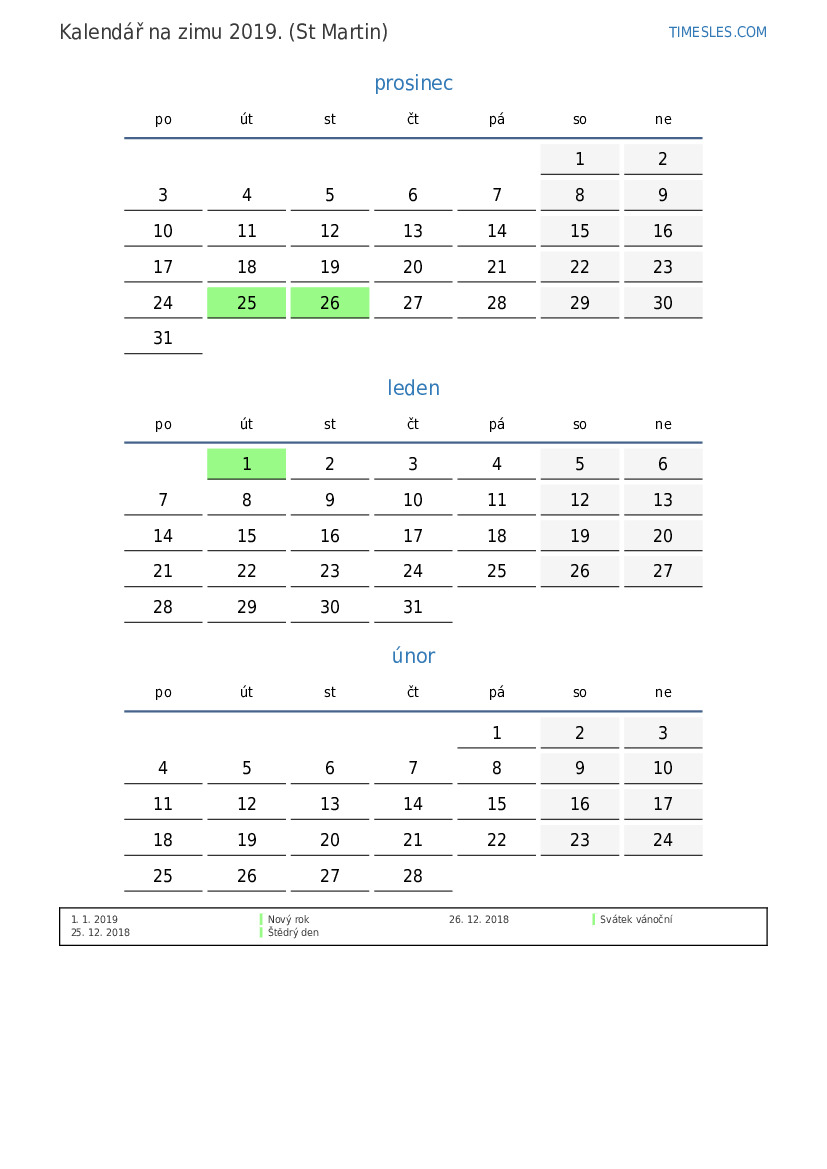Kalendář na zimu 2019 pro Sint Maarten