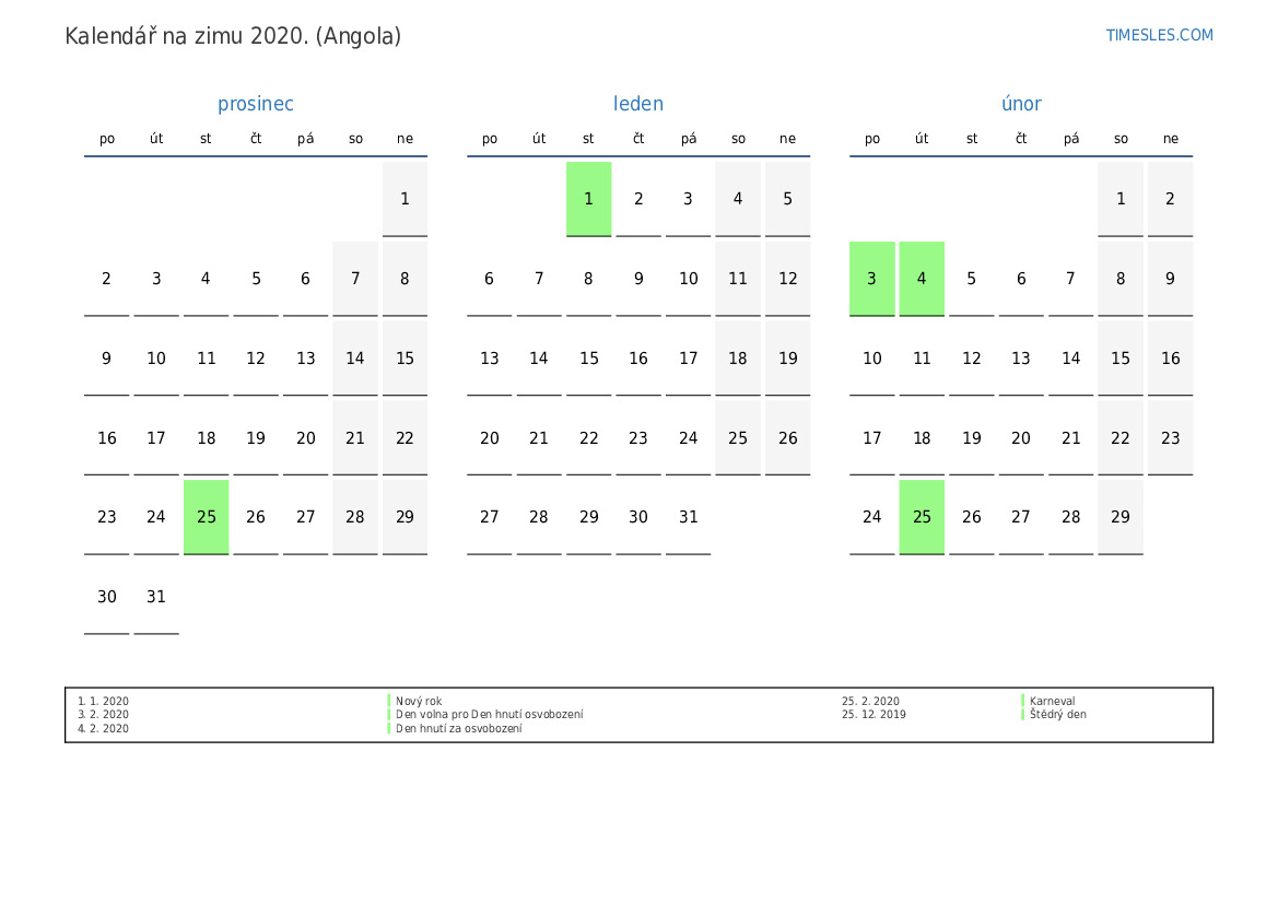 Stáhněte si a vytiskněte si kalendář PDF se svátky a víkendy na zimu 2020 pro Angolu