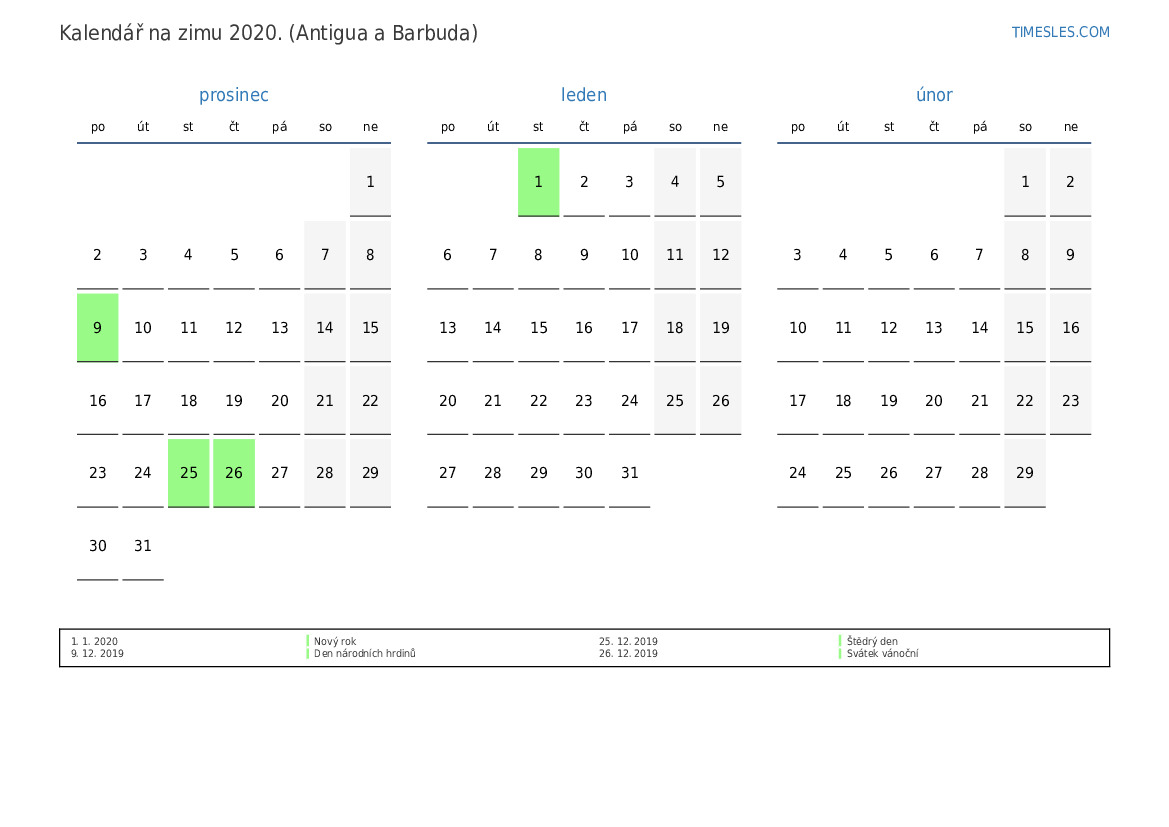 Stáhněte si a vytiskněte si kalendář PDF se svátky a víkendy na zimu 2020 pro Antiguu a Barbudu