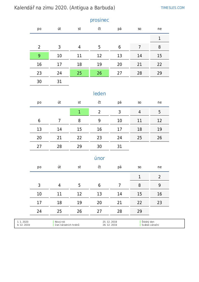 Kalendář na zimu 2020 pro Antiguu a Barbudu