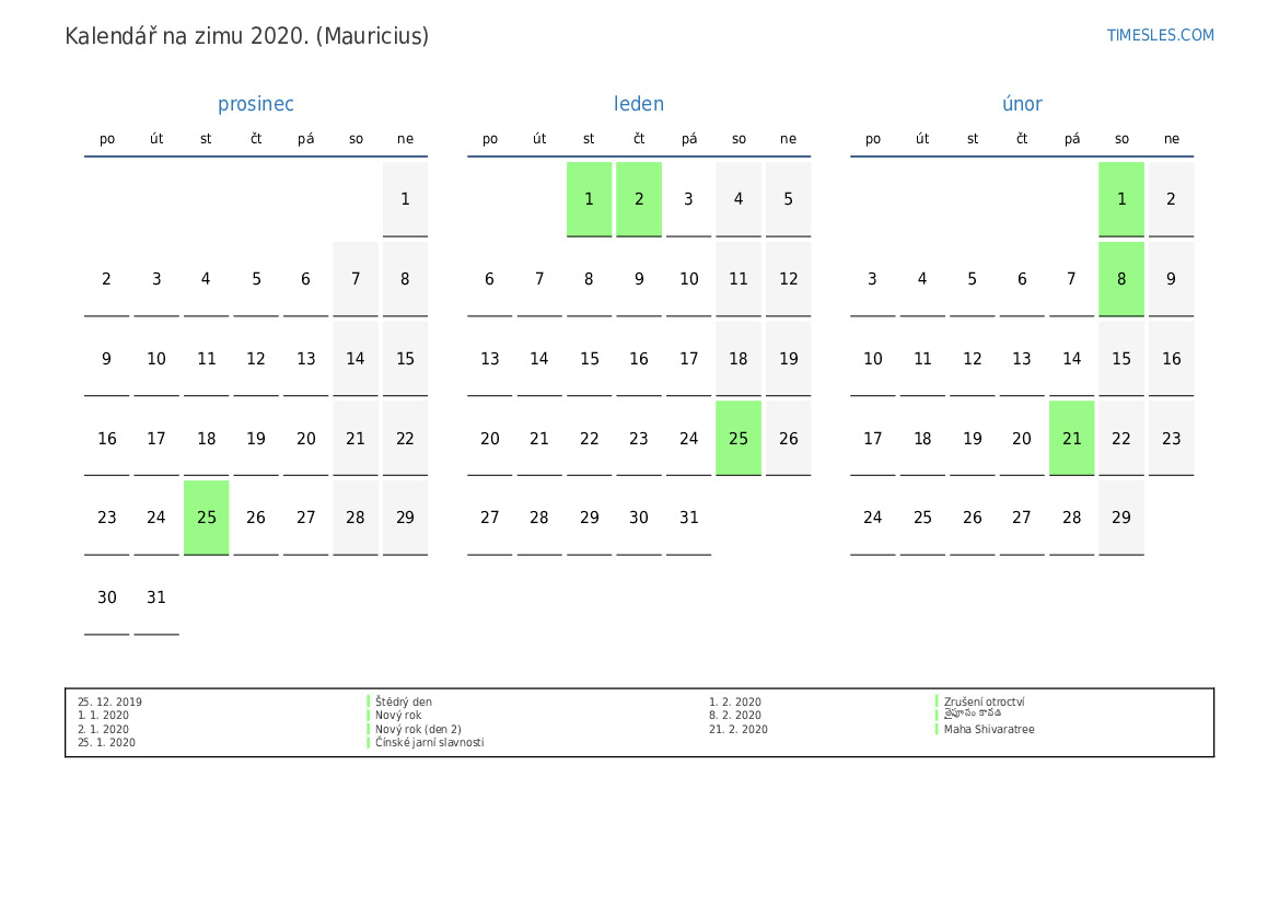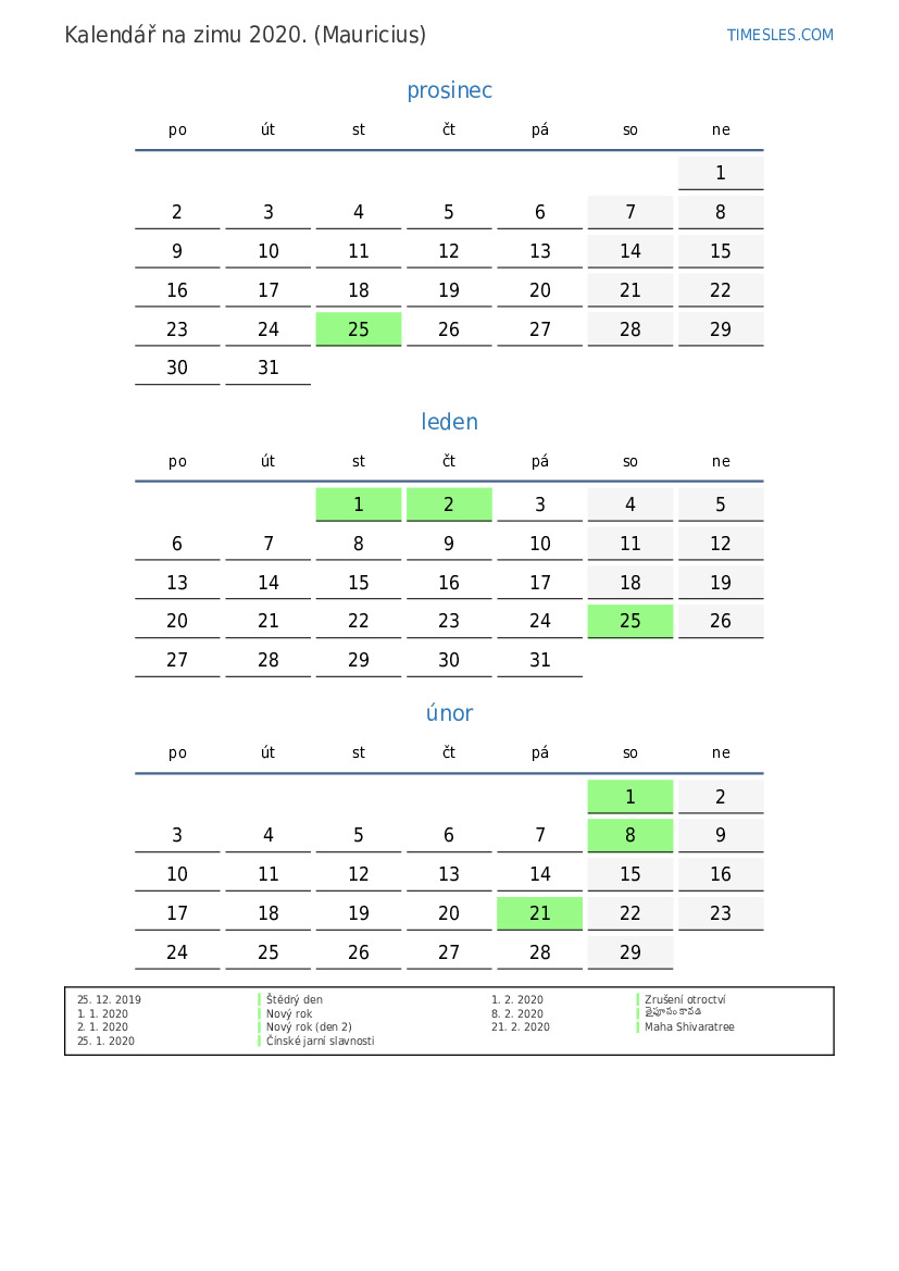 Stáhněte si a vytiskněte si kalendář PDF se svátky a víkendy na zimu 2020 pro Mauricius