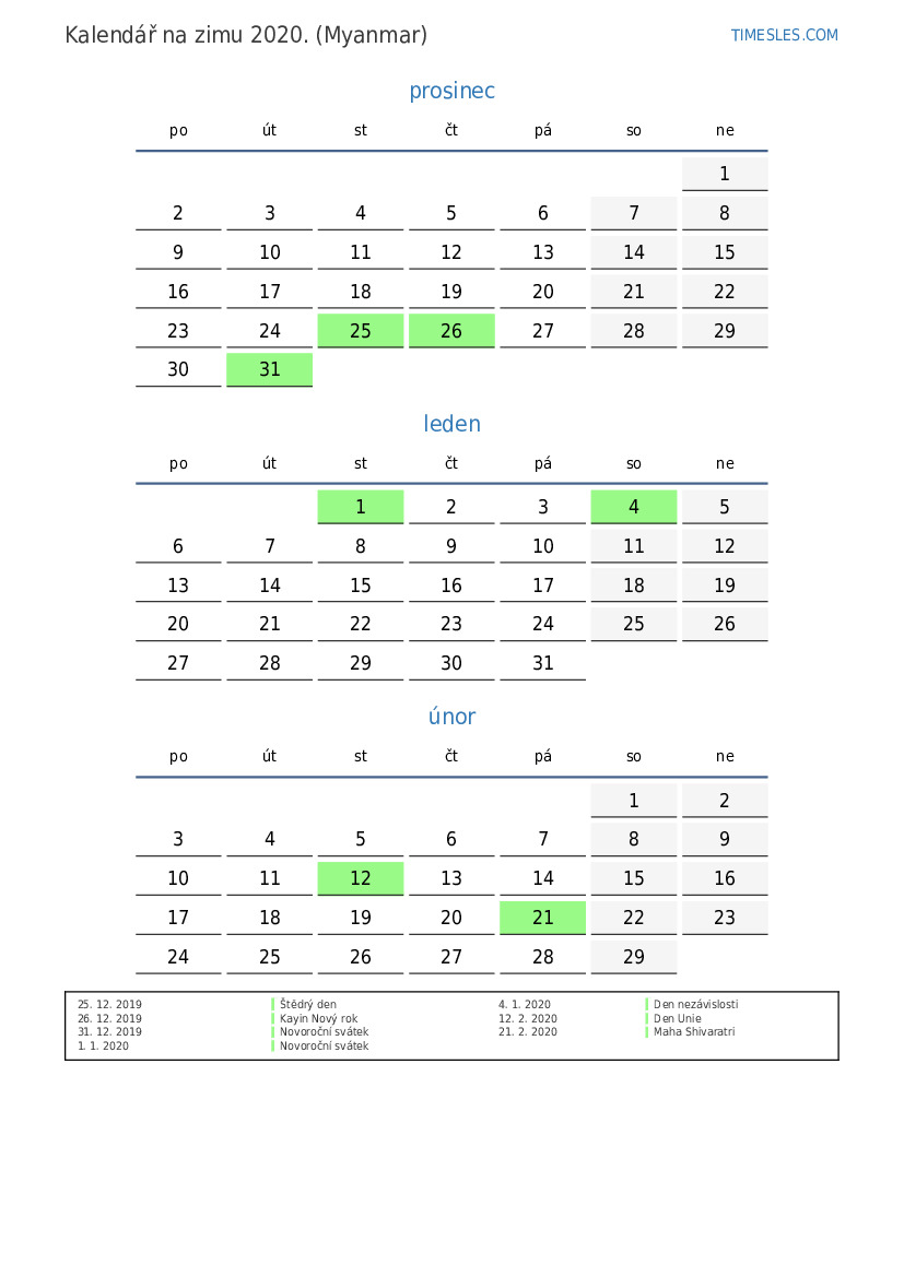 Stáhněte si a vytiskněte si kalendář PDF se svátky a víkendy na zimu 2020 pro Myanmar