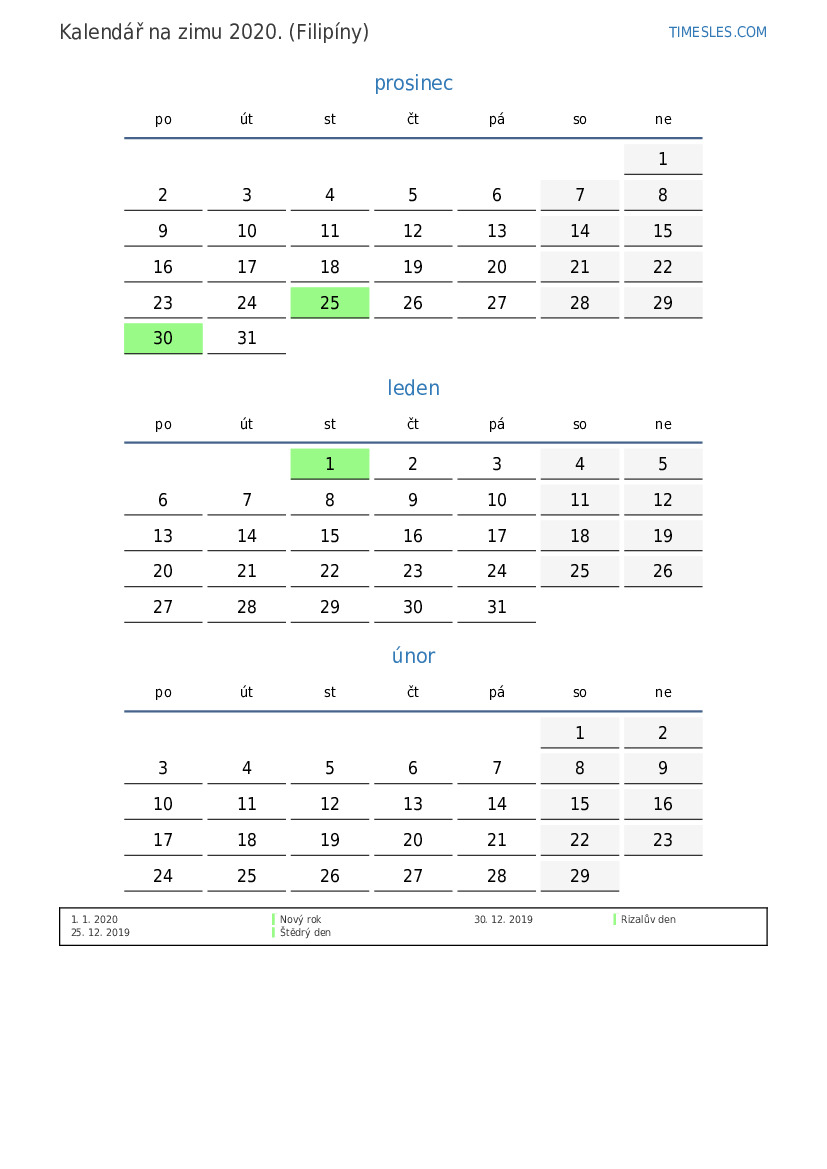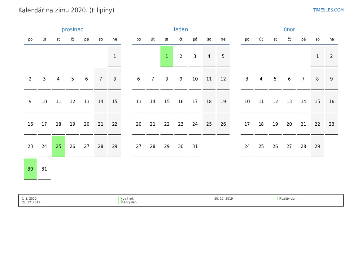 Stáhněte si a vytiskněte si kalendář PDF se svátky a víkendy na zimu 2020 pro Filipíny