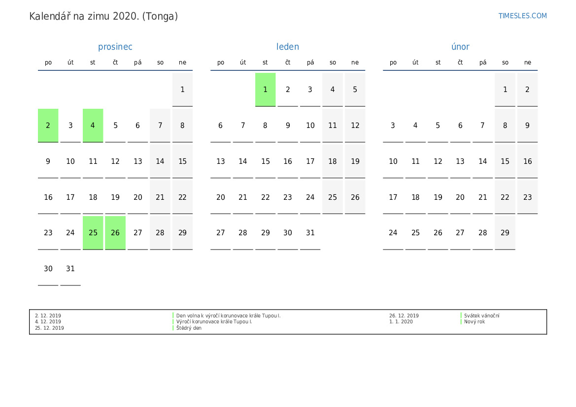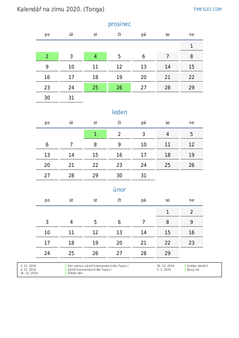 Stáhněte si a vytiskněte si kalendář PDF se svátky a víkendy na zimu 2020 pro Tongu