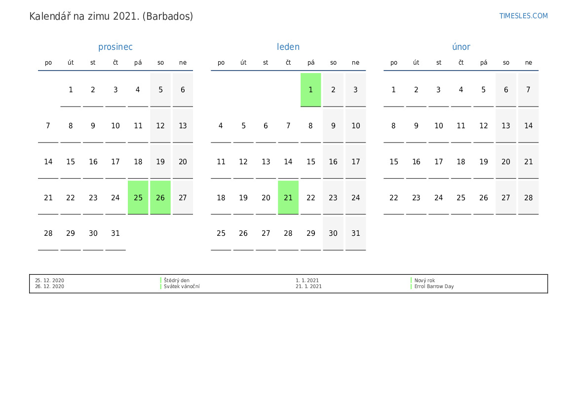 Stáhněte si a vytiskněte si kalendář PDF se svátky a víkendy na zimu 2021 pro Barbados