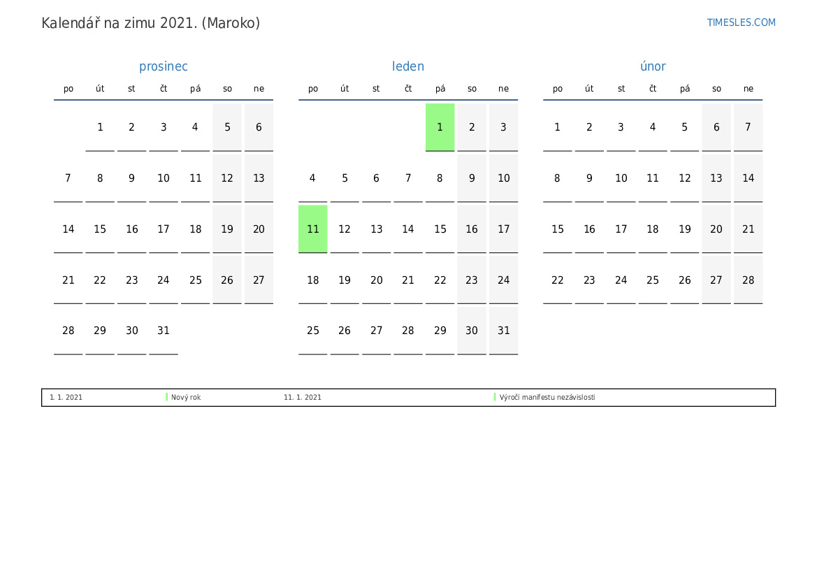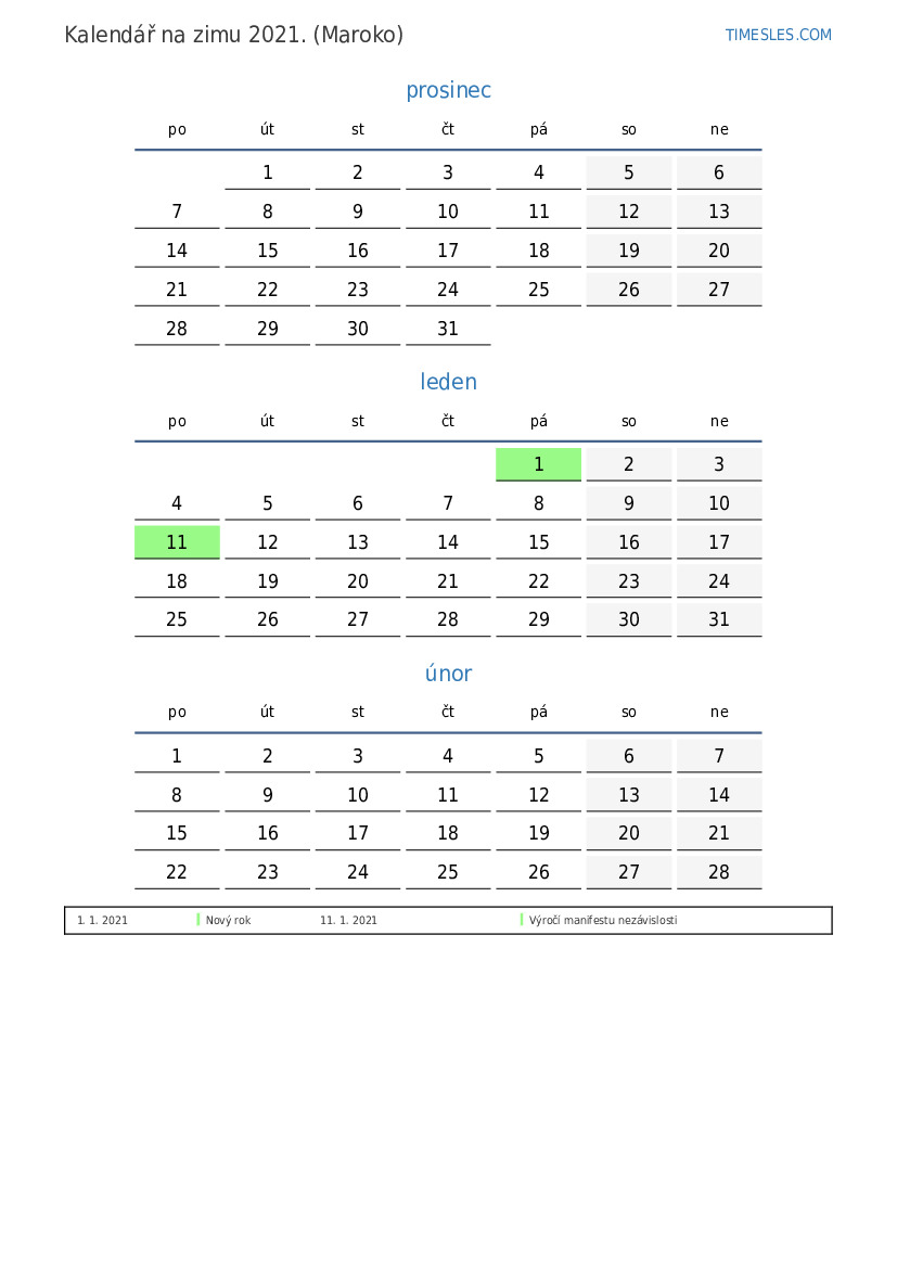 Stáhněte si a vytiskněte si kalendář PDF se svátky a víkendy na zimu 2021 pro Maroko