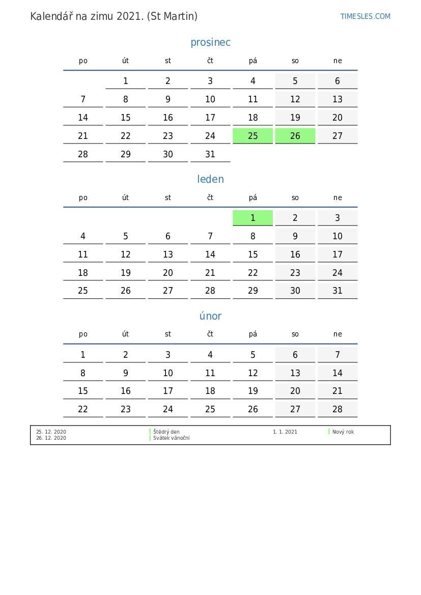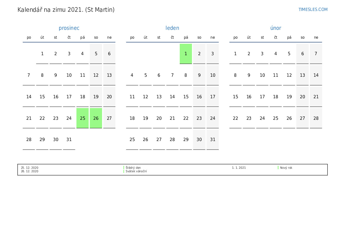 Kalendář na zimu 2021 pro Sint Maarten