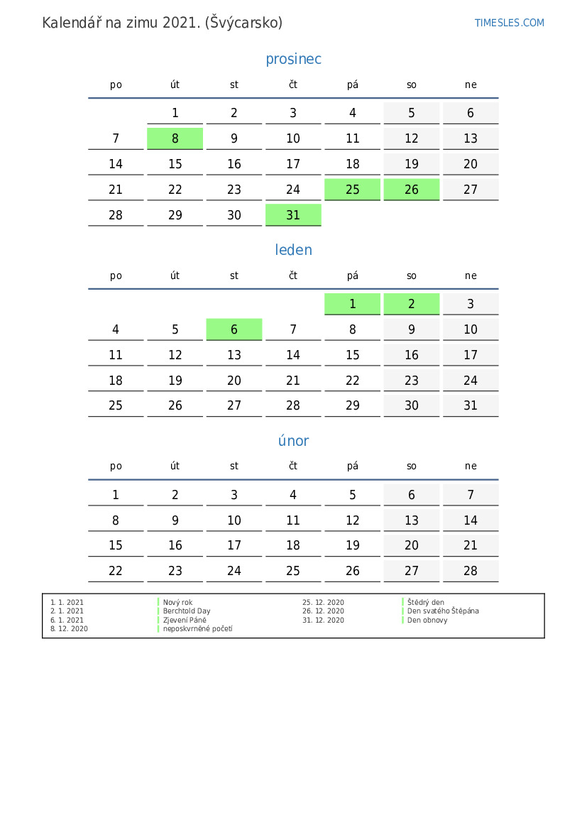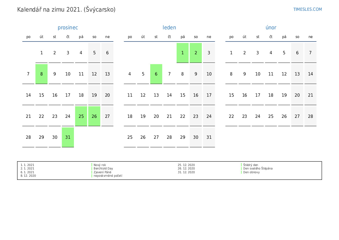 Stáhněte si a vytiskněte si kalendář PDF se svátky a víkendy na zimu 2021 pro Švýcarsko