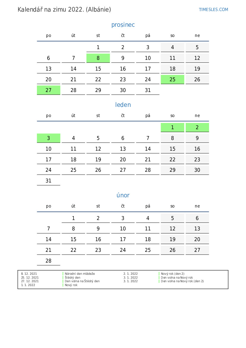 Stáhněte si a vytiskněte si kalendář PDF se svátky a víkendy na zimu 2022 pro Albánii