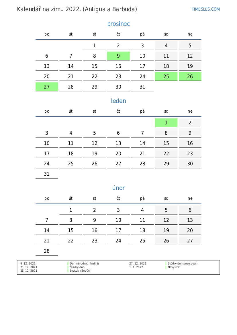 Kalendář na zimu 2022 pro Antiguu a Barbudu