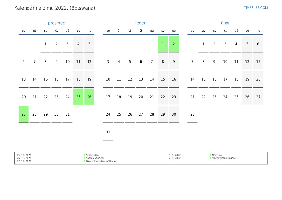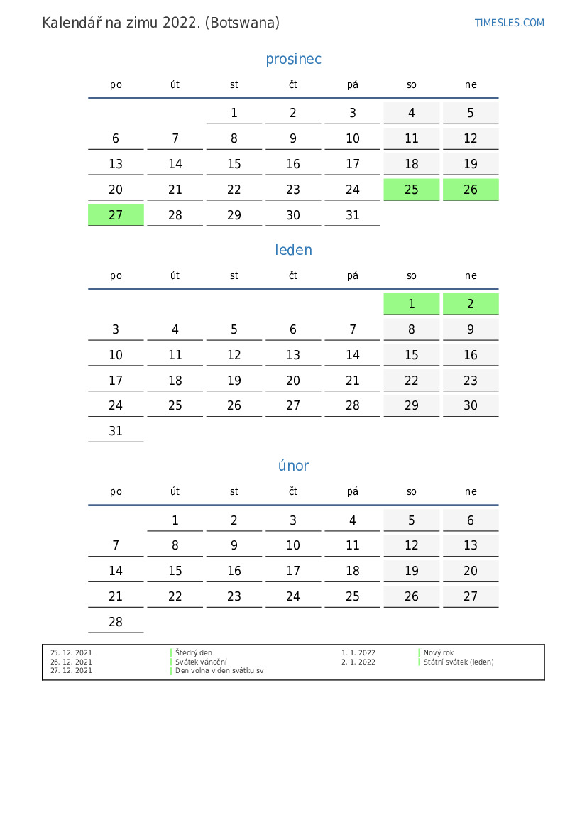 Stáhněte si a vytiskněte si kalendář PDF se svátky a víkendy na zimu 2022 pro Botswanu