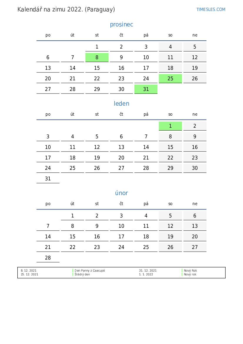Stáhněte si a vytiskněte si kalendář PDF se svátky a víkendy na zimu 2022 pro Paraguay