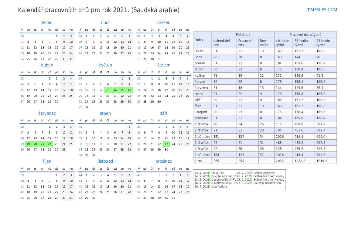 Stáhněte si a vytiskněte si kalendář pracovních dnů ve formátu PDF pro Saúdskou Arábii na květen 2021