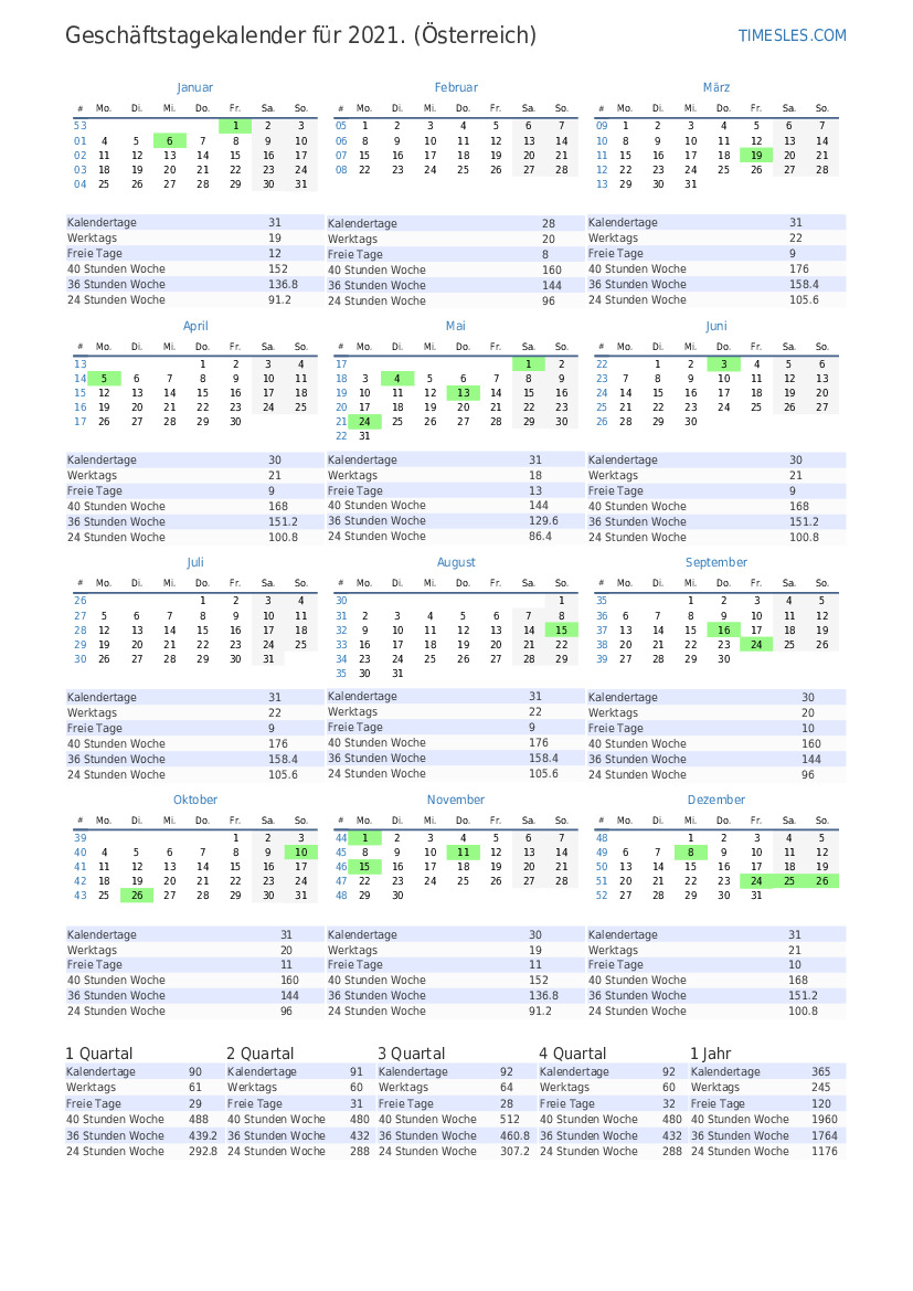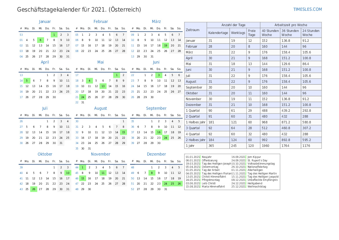 Laden Sie den PDF-Werktagskalender mit Feiertagen und Wochenenden für das 1. Quartal 2021 für Österreich herunter und drucken Sie ihn aus