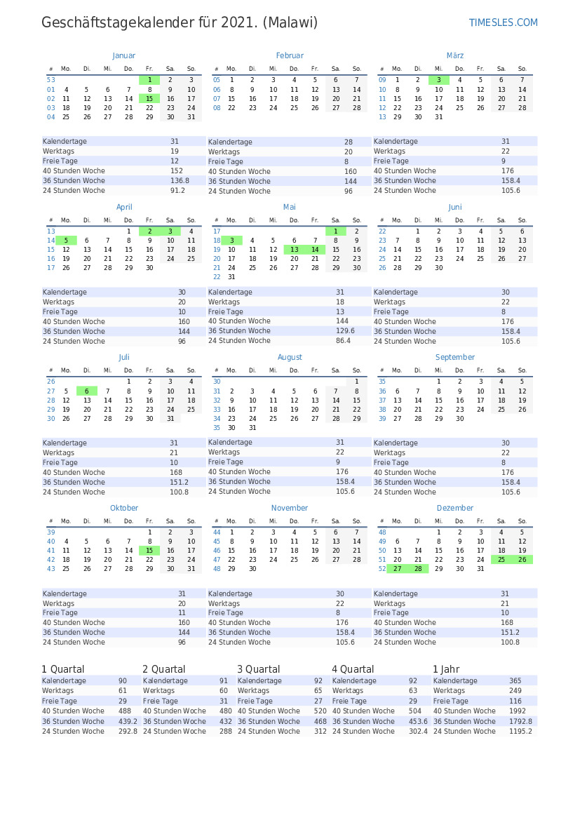 Laden Sie den PDF-Werktagskalender mit Feiertagen und Wochenenden für das 2. Quartal 2021 für Malawi herunter und drucken Sie ihn aus