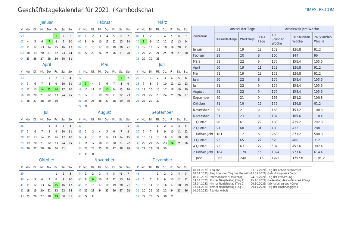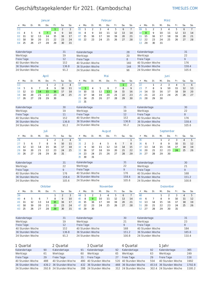 Für das 3. Quartal 2021 gibt es in Kambodscha 2 Feiertage und freie Tage. Das 3. Quartal 2021 beginnt am am Donnerstag und endet am am Donnerstag.