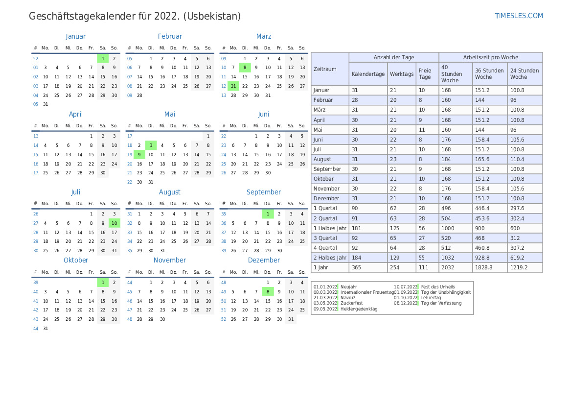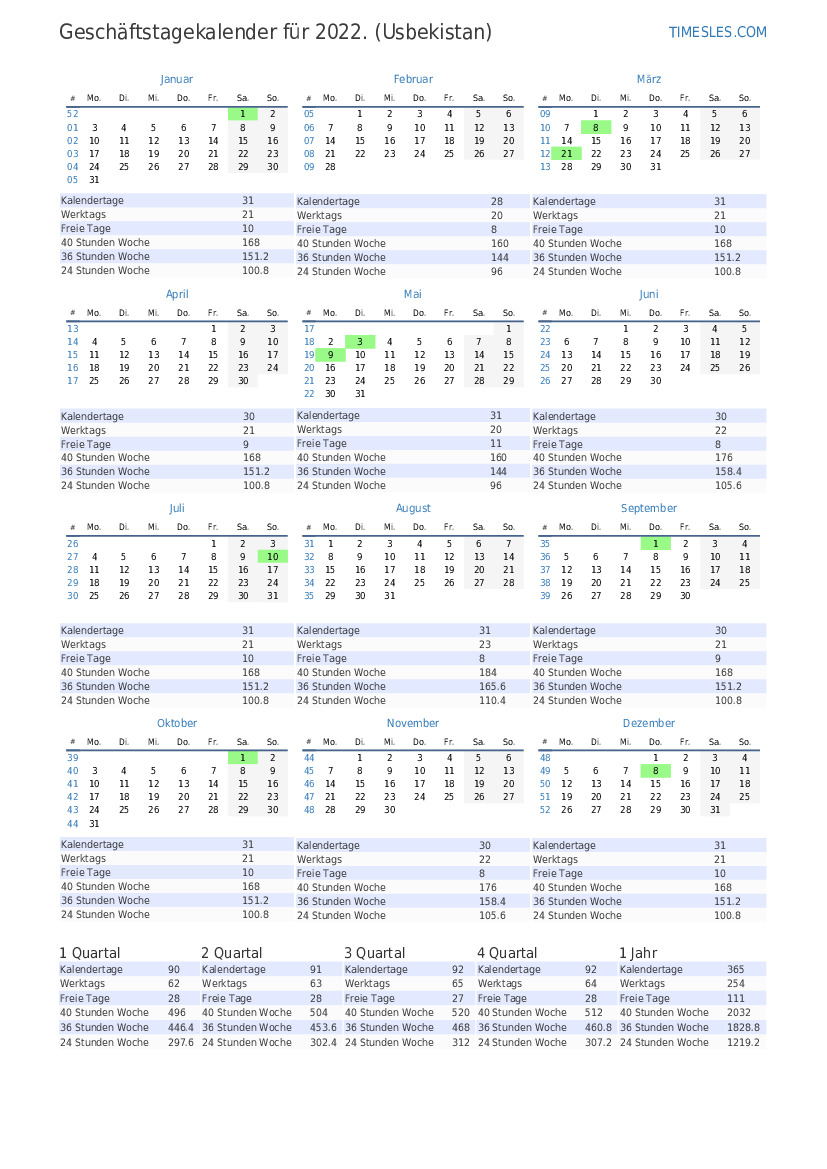 Laden Sie den PDF-Werktagskalender mit Feiertagen und Wochenenden für das 1. Quartal 2022 für Usbekistan herunter und drucken Sie ihn aus