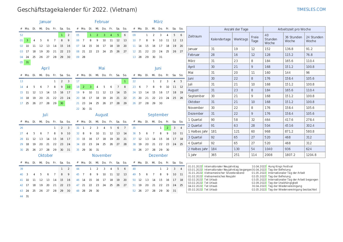 Geschäftstagekalender mit Feiertagen und Wochenenden für das 2. Quartal 2022 für Vietnam